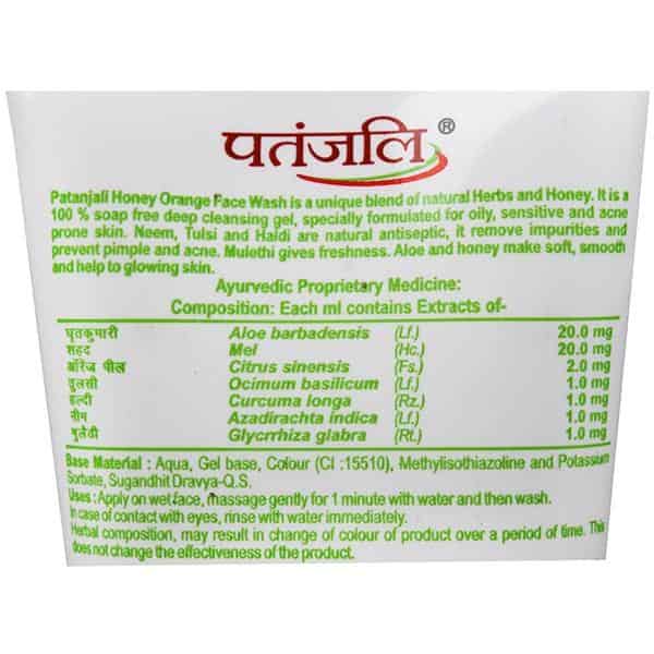 Patanjali Honey Orange Herbal Face Wash is a unique blend of natural herbs mixed with the goodness of honey. A 100% soap-free deep-cleansing gel, it is specially formulated for oily, sensitive and acne-prone skin. Neem, tulsi, and turmeric (haldi) are natural antiseptics that remove impurities, act as disinfectant, and prevent pimples and acne from forming. Mulethi adds freshness to the skin and aloe vera and honey leave skin soft, smooth and glowing. Use twice daily or as often as required.