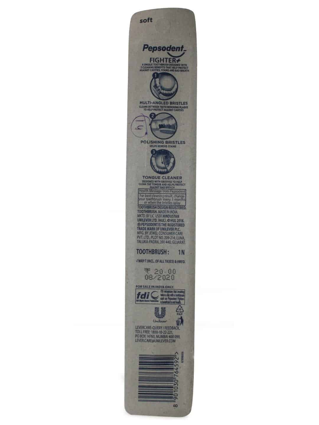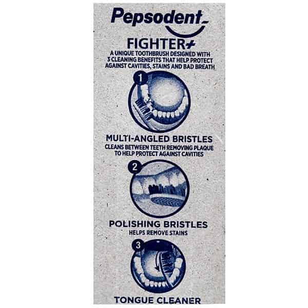 Pepsodent Fighter Toothbrush Its interdental bristles profile cleans in between teeth efficiently and are supple so that they don't hurt gums. It is stimulated by index finger for better reach.