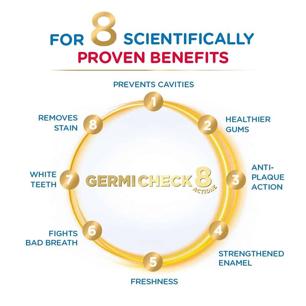 • The germicheck formula helps fight cavity-causing germs even 12 hours after brushing