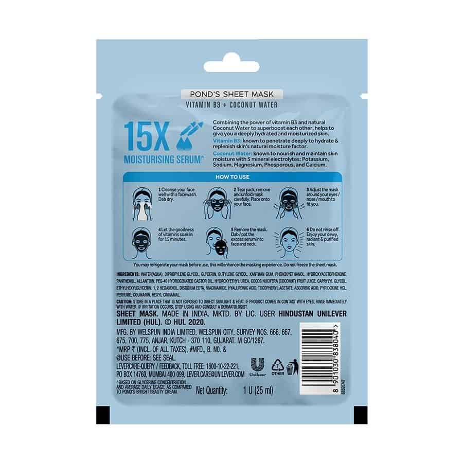 Pond's brings to you its first range of Vitamin Duo Sheet Masks. If you have dull skin that is yearning for some hydration and glow that is infused with 100% Natural extracts and Goodness of Vitamins. Our Dual-Action Sheet Mask with 15X moisturising serum is your fix. With Vitamin B3 and the goodness of 100% Real Coconut Water, our Hydrating sheet mask will not only leave your skin feeling hydrated but will help you get that Clear glowing skin.