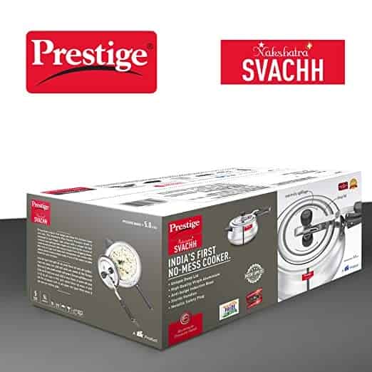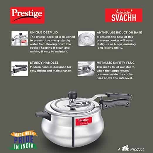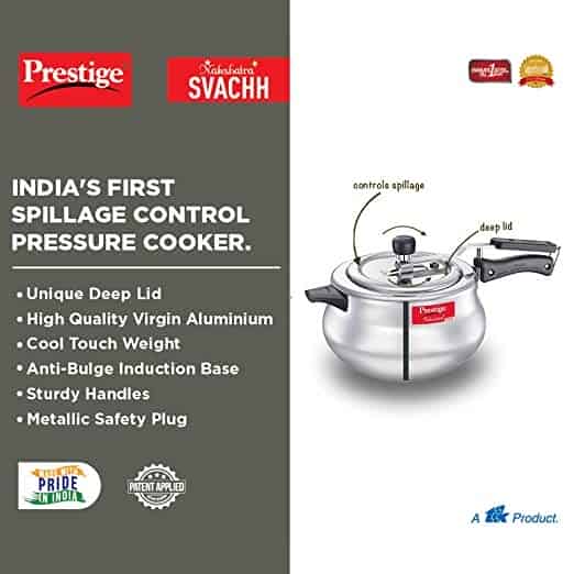 The Nakshatra Plus Svachh Pressure handi is designed to last longer and comes with a unique lid that contains any spillage that might occur during the course of cooking and prevents the messy liquid from dripping down.