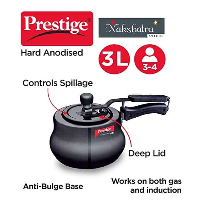 Materia type: Hard Anodised; Base type: Gas & Induction Compatible Base; Capacity: 3 L; Lid type: Inner Lid; Base thickness (in mm): 3 mm; Weight: 1.2 kg; Colour Black. Inner Lid Locking Mechanism