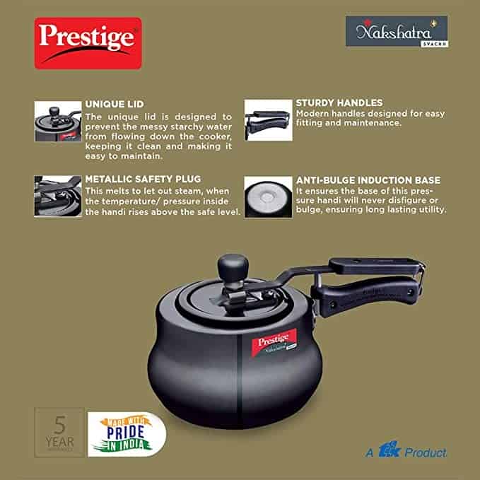 The Nakshatra Plus Hard Anodised Svachh Pressure Handi is designed to last longer and comes with a unique lid that contains any spillage that might occur during the course of cooking and prevents the messy liquid from dripping down.