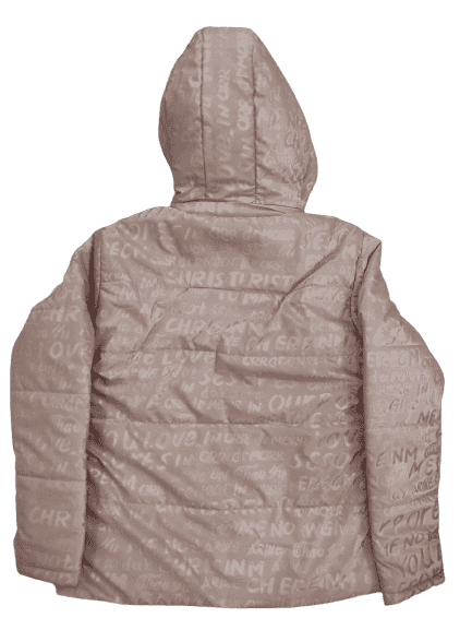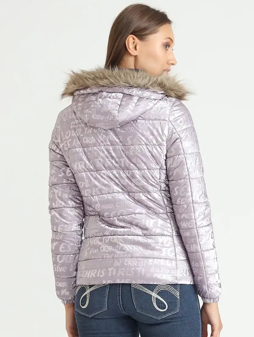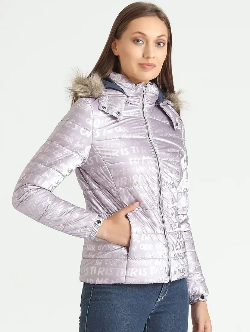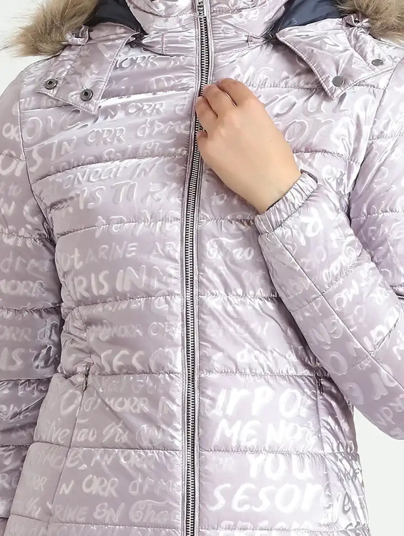 Lavender and white typography print padded jacket, has a mock collar, 2 pockets, zip closure, long sleeves, straight hemline, polyester lining.