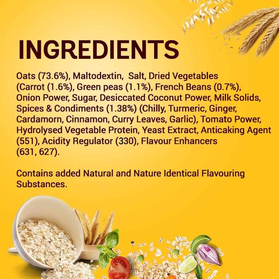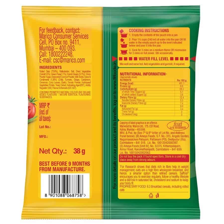 Saffola Masala Veggie Twist Oats help you to stay fit. It is prepared from 100% natural whole grain oats. Good source of dietary fibre. Saffola Masala Oats has a burst of flavours and is made from 100% natural wholegrain oats along with real vegetables and the choicest of masalas. Eating Saffola Masala Oats as part of your daily routine is not just fantastically healthy and delicious, but also requires minimal effort for preparation; ready in 3 minutes. It satisfies the cravings for those savoury flavours as a breakfast cereal or during different times of the day.