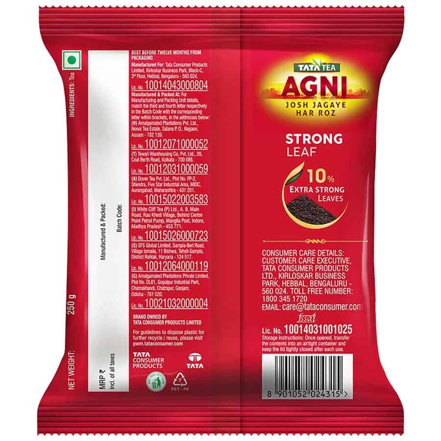 Tata Tea Agni is a superior blend of Assam tea along with 10% extra-long leaves to give you a strong taste. Agni is the second-largest tea brand in Tata Tea umbrella, with a presence across more than 22 Indian states. Agni was first launched as a product especially for those who aspired to shift from loose to branded tea. Agni reinvented itself by migrating to the Tata Tea umbrella.
