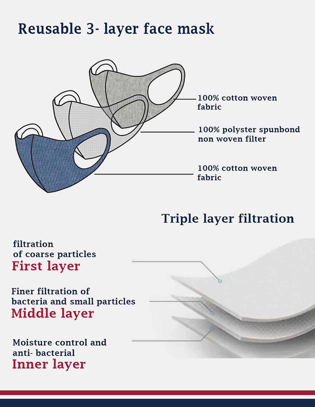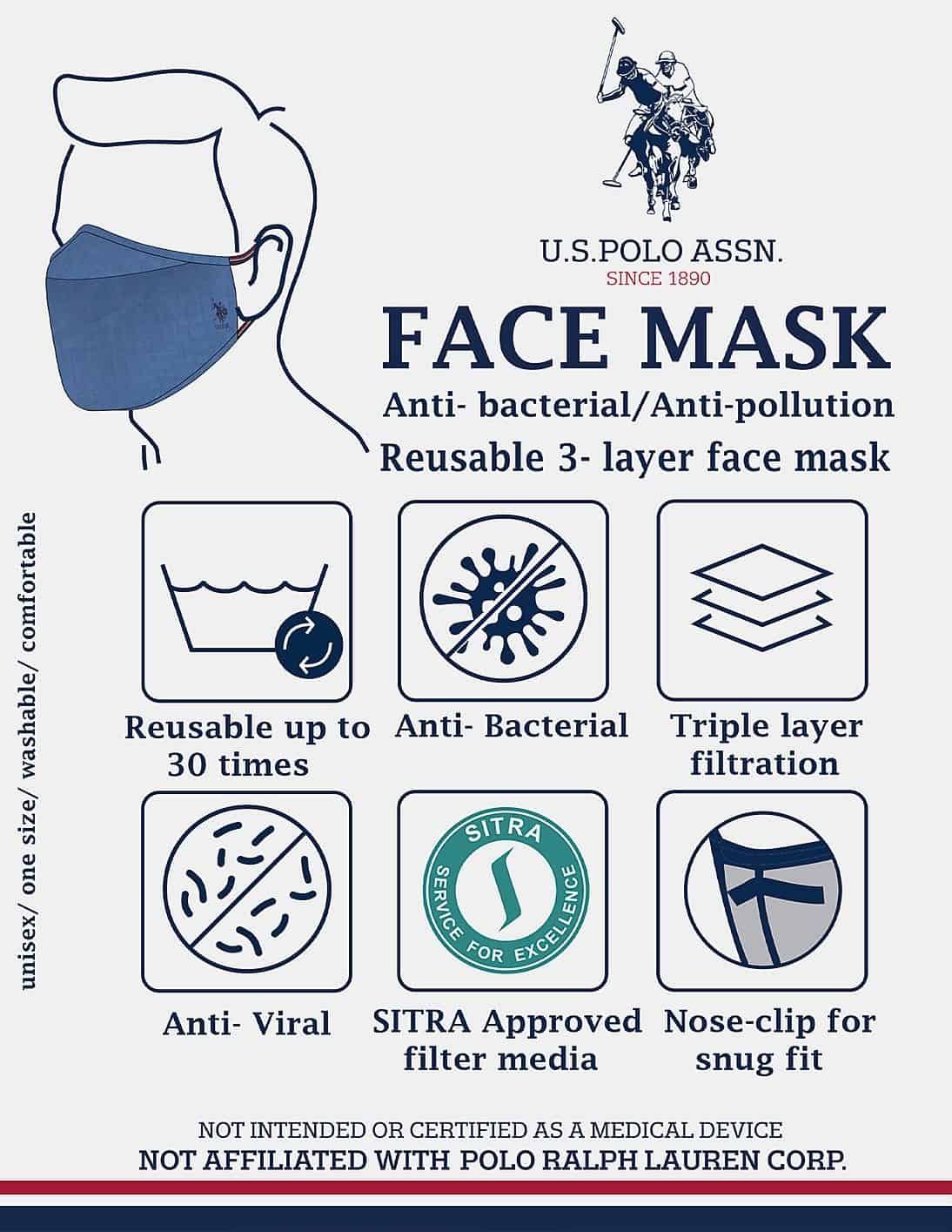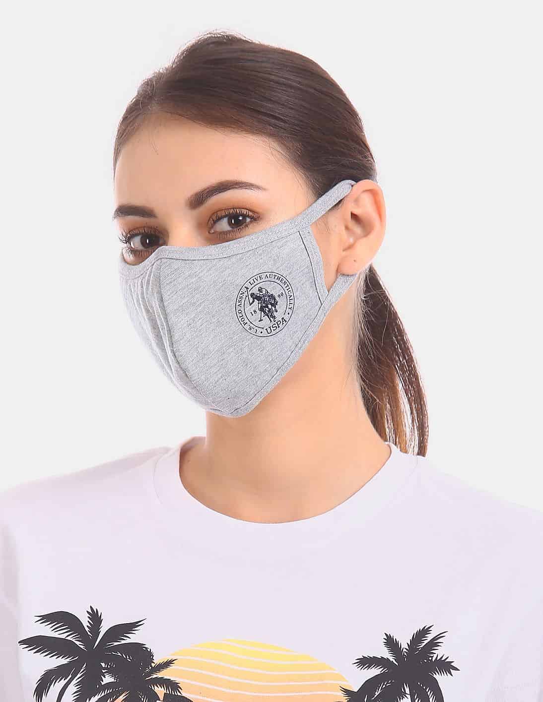U.S. POLO ASSN. Unisex Adults Grey Triple Layer Washable Anti Bacterial Heathered Face Masks - Pack Of 3
