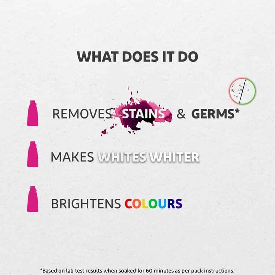 • Whitens your whites and brightens your coloured garments with its active brighteners