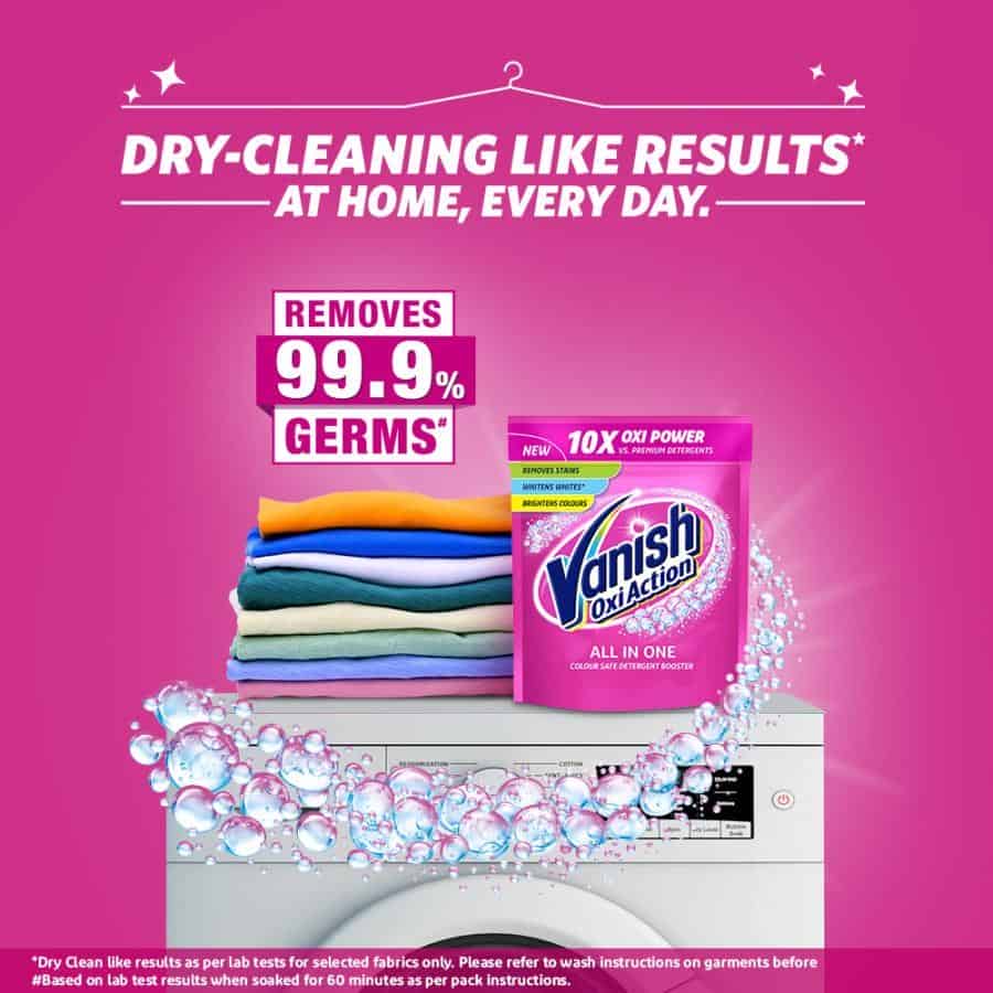 • Add Vanish along with your detergent and get dry-clean like results for your everyday clothes in every wash