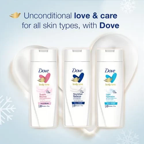 Enjoy the feeling of touchably soft, supple and radiant skin. Dove, Nourishing Body Care Nourished Radiance Lotion & Body Butter are dermatologically tested. It provides long-lasting Moisturisation. This Nourished Radiance Lotion is a fast-absorbing lotion. It is formulated with a plant-based moisturiser. Goodness, that lasts