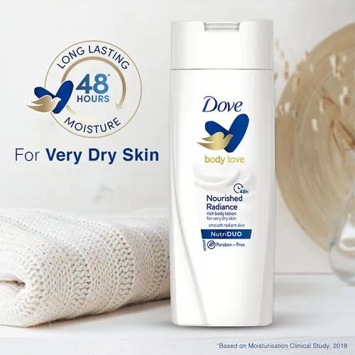 The Dove Difference: Made with care. When you have very dry skin, moisturiser is essential – but often you need more intensive nourishment. Ultra-rich and intensely nourishing, Dove Nourishing Body Care, Nourished Radiance Body Cream has been created for all skin types to combat dry skin. The formula deeply nourishes (Within the stratum corneum) your skin and over the period improves skin moisturisation too.