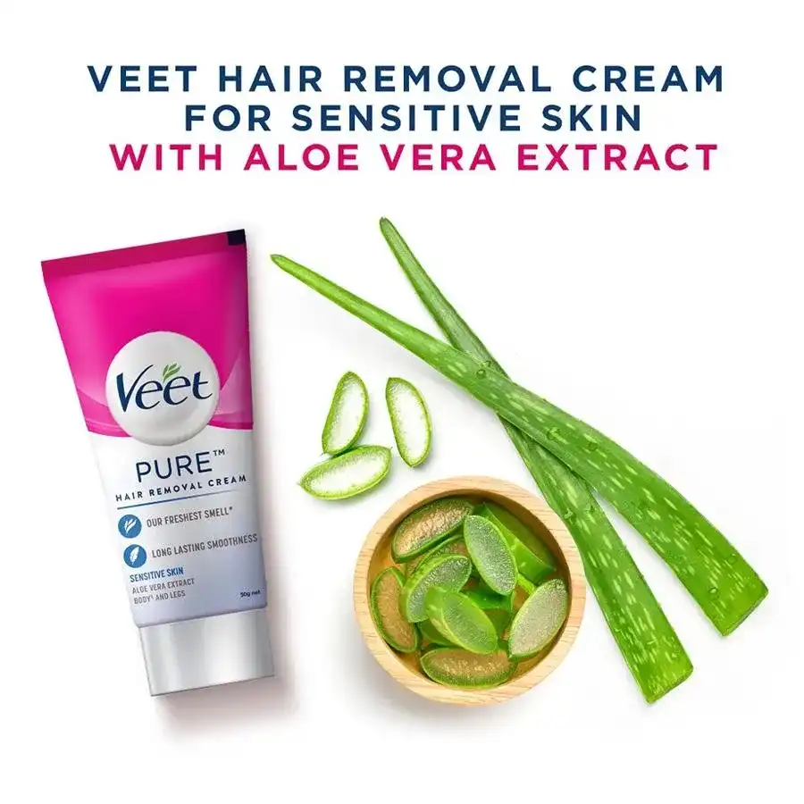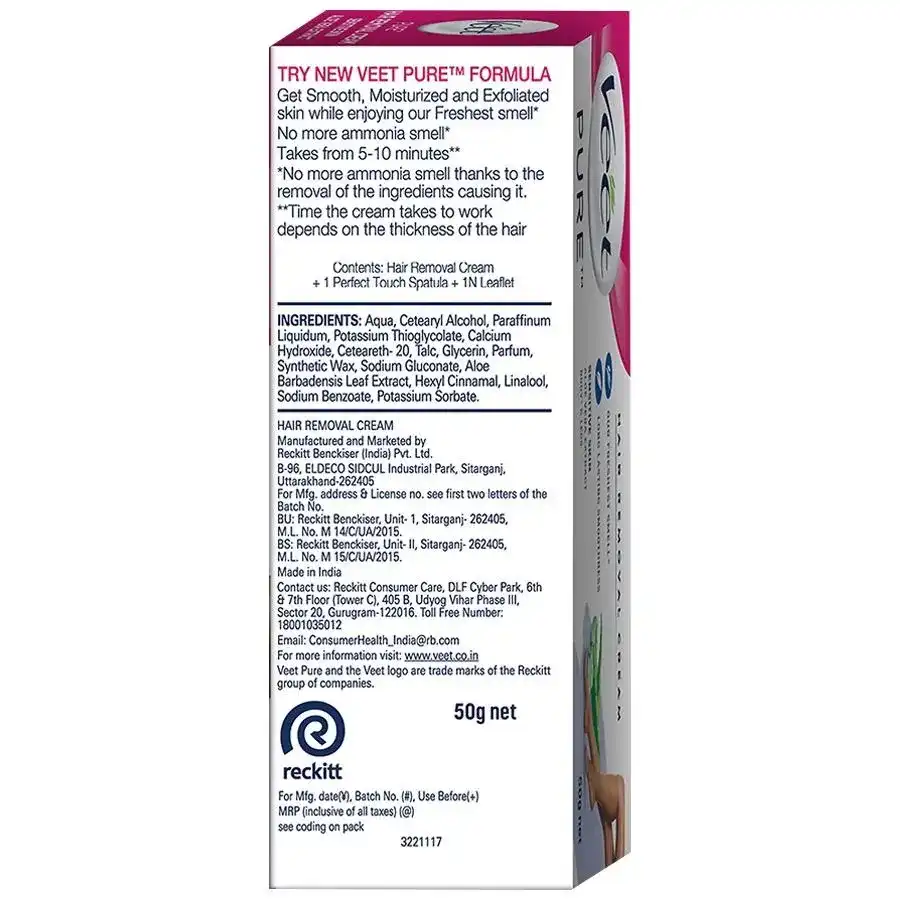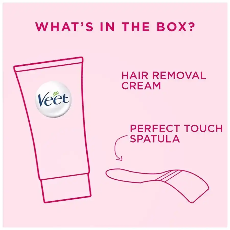 Get the smooth skin and the freedom to wear any look, any time with Veet. Veet Pure Hair Removal Cream for Sensitive Skin, enriched with Aloe Vera, is the right solution when going to the salon is not an option. It effectively removes even short stubborn hair and leaves skin moisturized for up to 24 hours*. It can be used on legs, arms, bikini line and underarms for a perfectly finished smooth, moisturized and exfoliated skin. Veet Pure Hair Removal Cream for Sensitive Skin gives you perfect hair removal results in just 5-10 minutes. Follow the steps mentioned on the pack using the spatula provided. Before using the product, please read pack precautions carefully. With regular use; get fewer, finer and softer hair growing back!