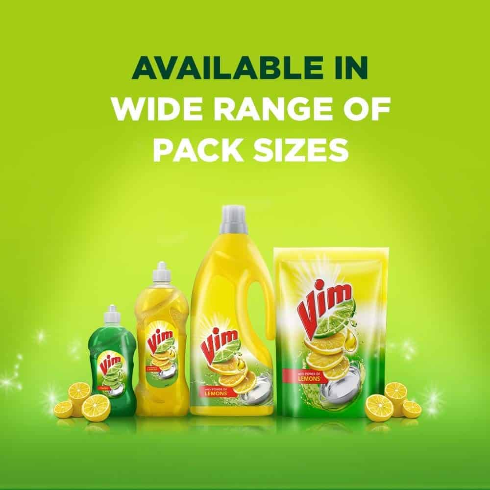 • Vim Dishwash Liquid Gel is available in different sizes and packaging in the market which include bottles and pouch packs