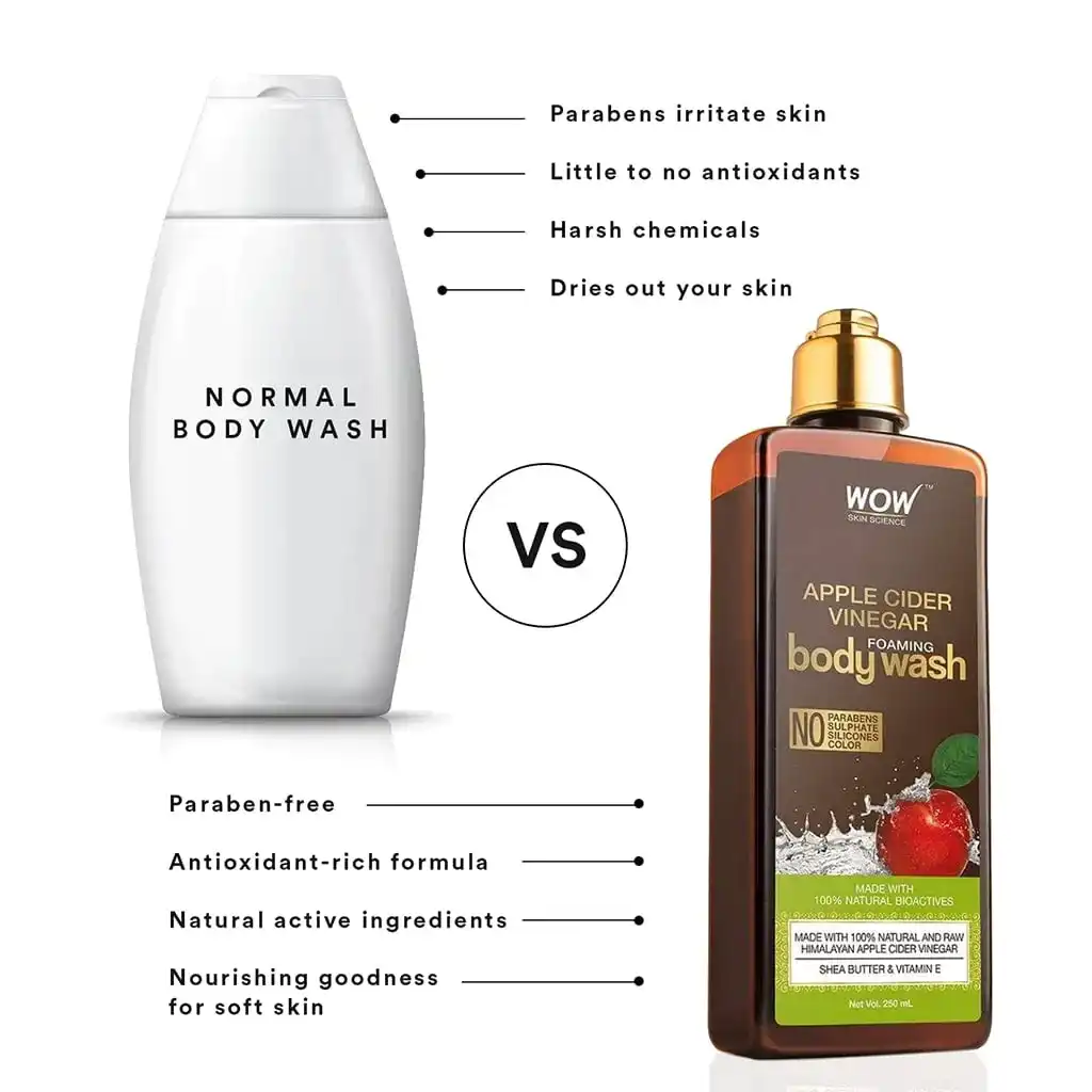 Our apple cider vinegar body wash is rich in vitamin A, restores elasticity, and reduces inflammation. It is powered with excellent bioactive such as organic apple cider vinegar, shea butter, and vitamin E, it leaves your skin feeling lush and loved. Its luscious lather is rich and generous. It is suitable for all skin types. WOW Skin Science apple cider vinegar body wash contains no harmful sulfates or parabens.