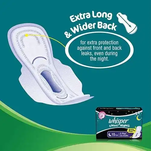 P&G is one of the largest and amongst the fastest growing consumer goods companies in India. In 1989, P&G India, launched Whisper; the breakthrough technology sanitary napkin which revolutionized the Indian feminine hygiene category. The product was designed keeping in mind the personal hygiene of thousands of Indian women. Whisper Maxi Nights Wings Sanitary Pads XL is specially designed for heavy flow during the period. It has an extra-long body and wider back that provides protection from leakage even during nighttime. Now enjoy a comfortable feel and long-lasting protection with these cushiony, extra-large sanitary pads.