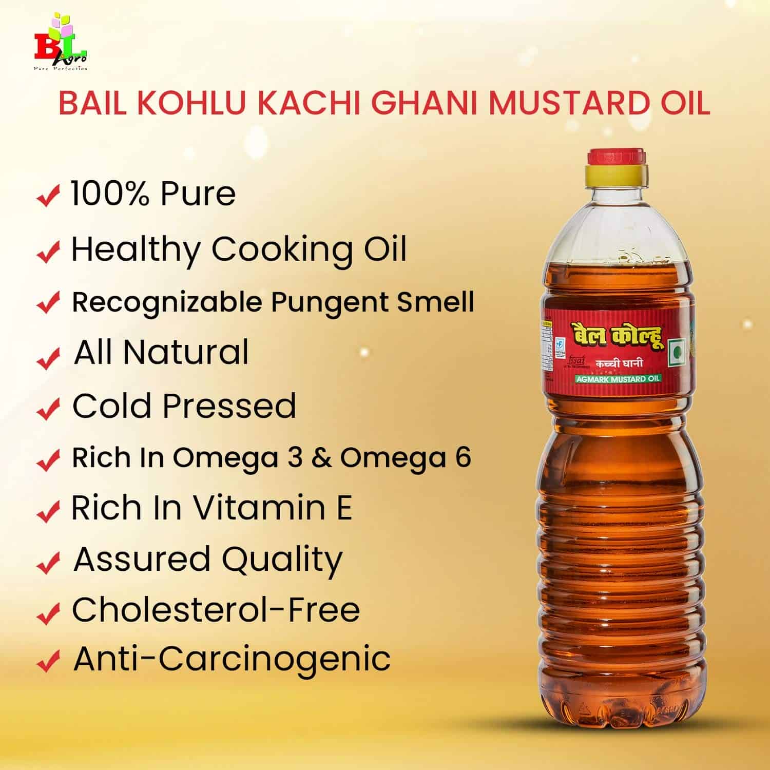 • Cold Pressed: This oil from Bail Kolhu is cold pressed, meaning it is made without any added heat while pressing the mustard seeds, due to which the essential oils, aroma, most of the flavor and important nutrients from the sunflower seeds are retained in the final product. Cold pressed oils also encourage in collecting good cholesterol for our bodies.
