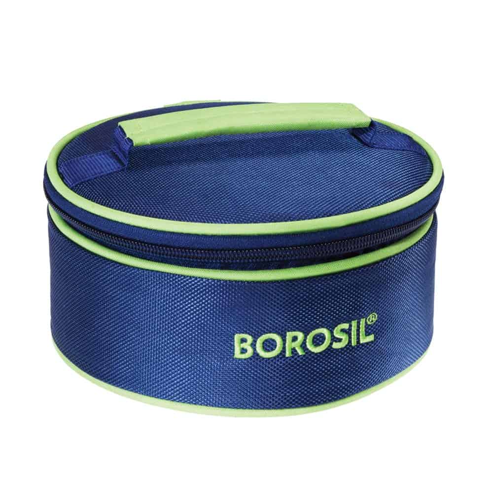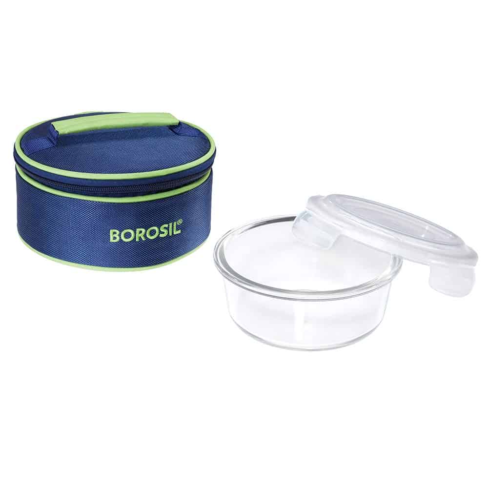 Materia type: Borosilicate Glass; No. of containers: 1; Capacity of containers: 1 Containers: 620 ml ; Contents include: 1 Containers: 620 ml + 1 lunch bag ; Colour: Bag Colour: Blue | Container Colour: Transparent