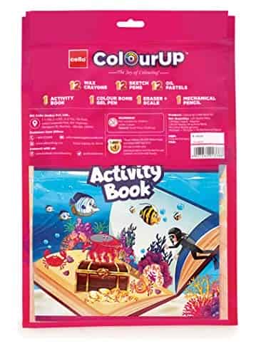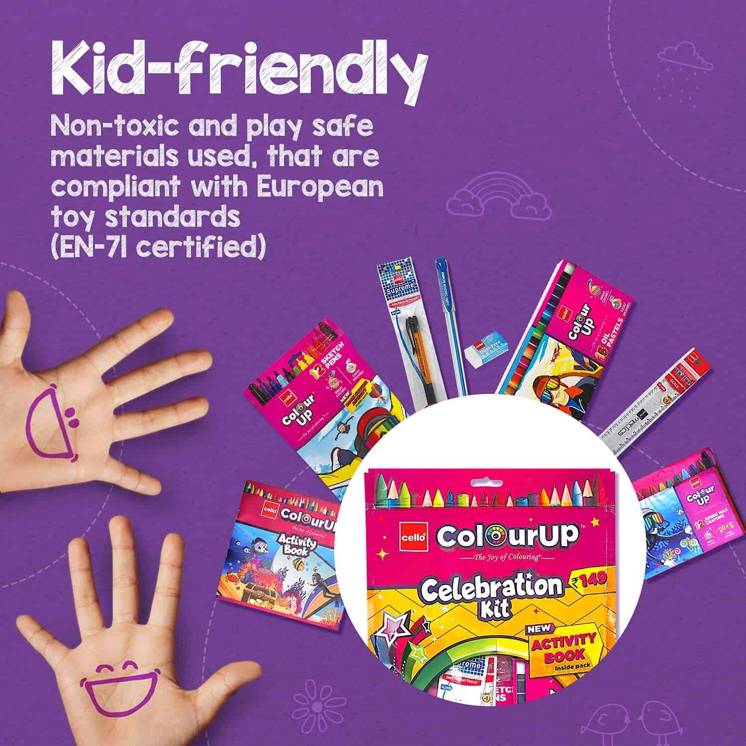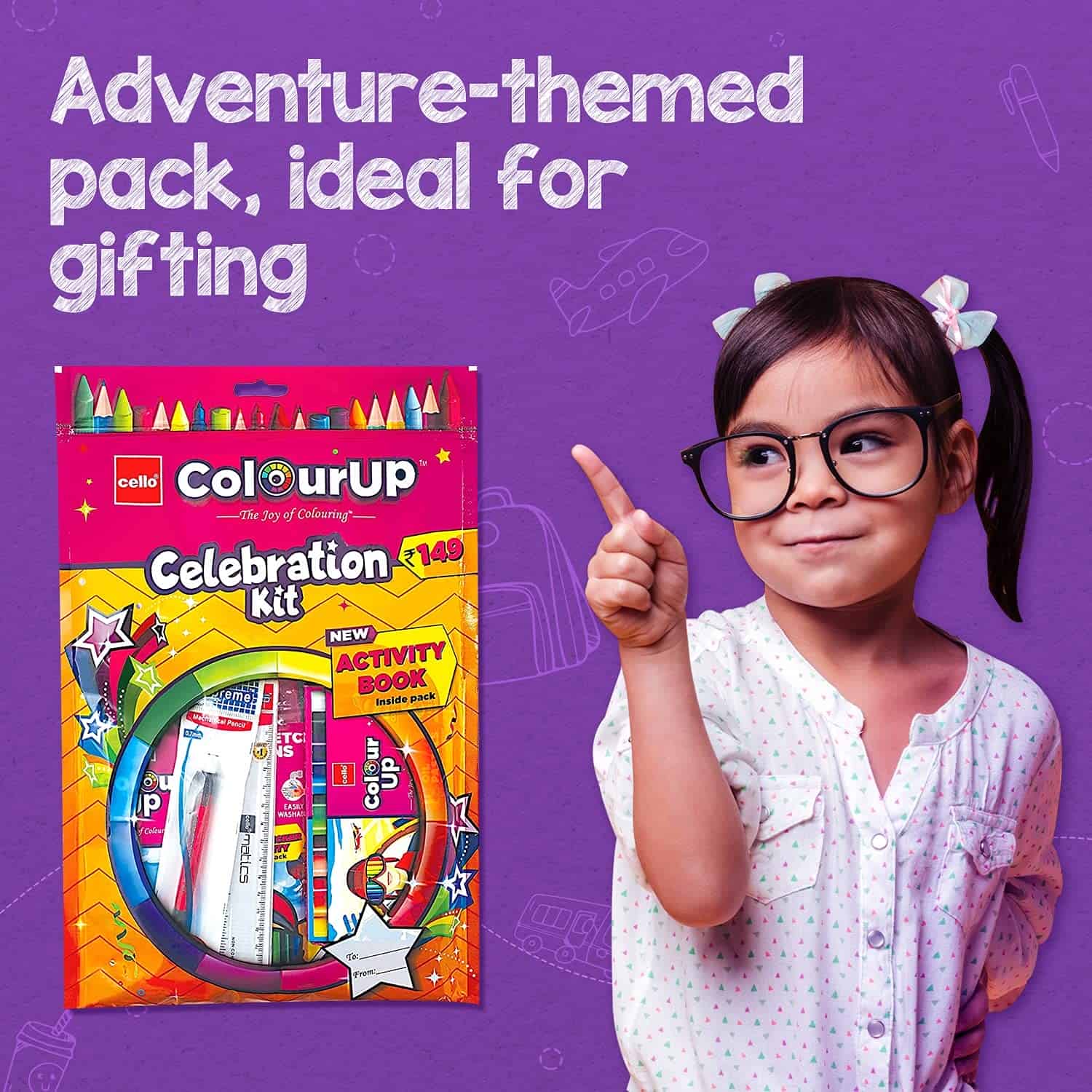 • The Cello ColourUp Celebration Kit - Gift Pack contains an assortment of 12 Wax Crayons Colours Set, 12 Oil pastels, 1 Colour Bomb Pen, 1 Ruler, 1 Eraser, 1 Activity Book, and 12 Sketch Pens.