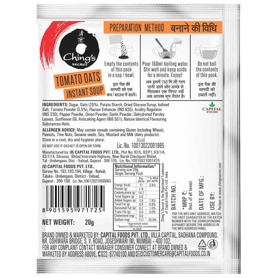 Ching'S Secret Tomato Oats Instant Soup is made by using the finest ingredients. We bring to you a premix of tomato soup, it is an instant mix. This helps you make delicious tomato soup at home without any hassle. You just need to add boiling water to this mix. It makes smooth, creamy and delicious soups. It is an excellent source of antioxidants and vitamins C and E. It is a well-balanced soup with the right amount of acidity and sweetness. You just need to add it to hot water and your delicious healthy soup is ready in just a minute.