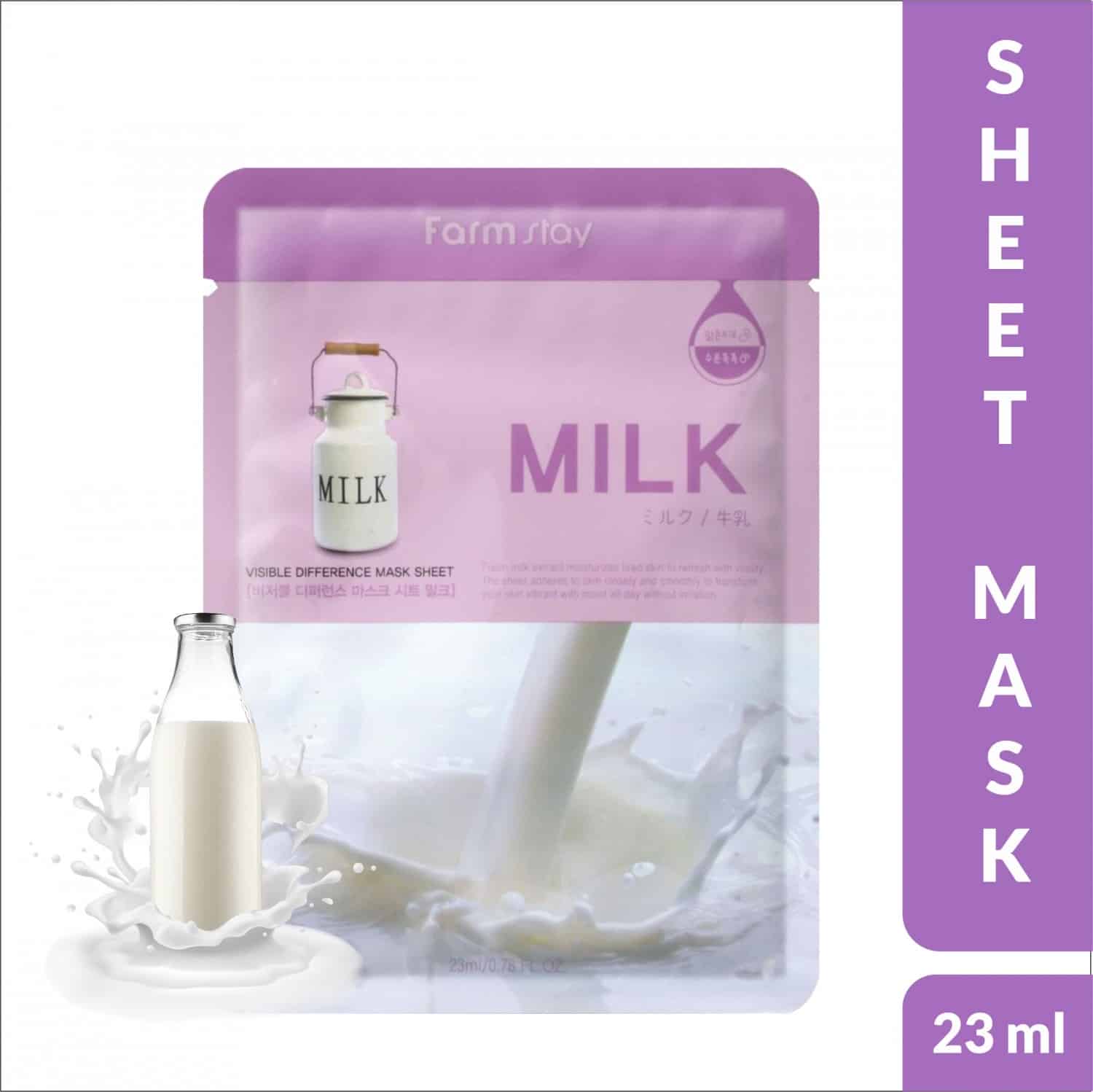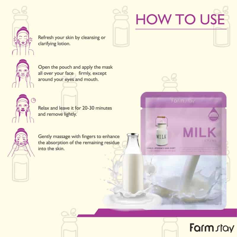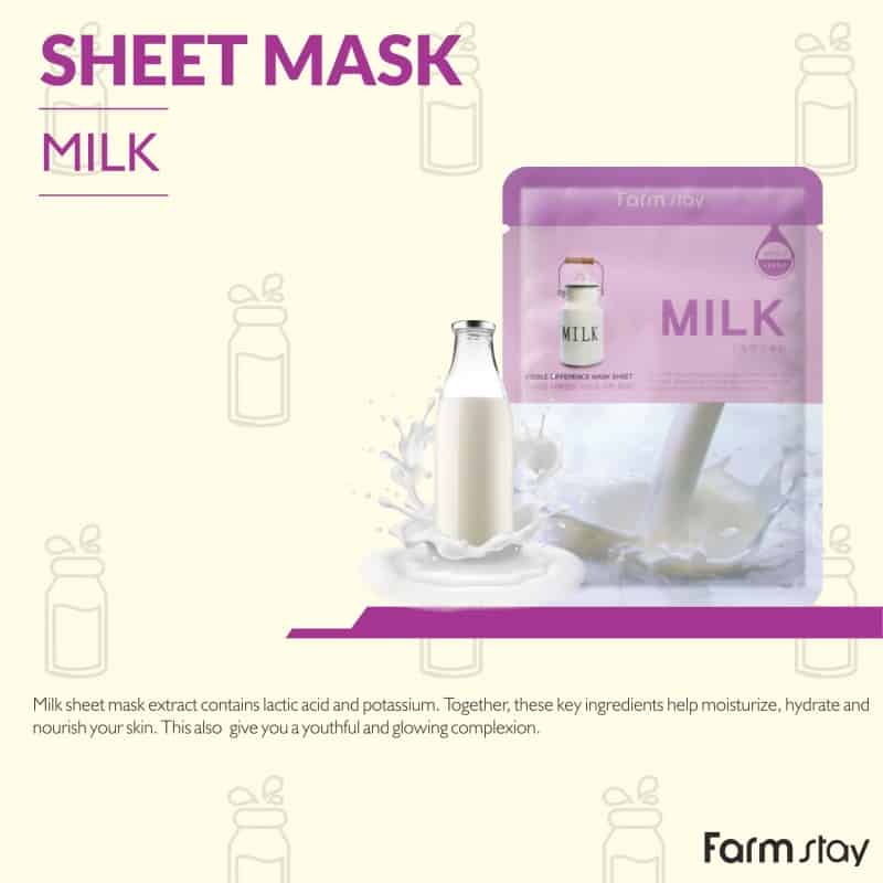 Milk sheet mask extract contains lactic acid and potassium. Together, these key ingredients help moisturize, hydrate and nourish your skin. This also give you a youthful and glowing complexion.