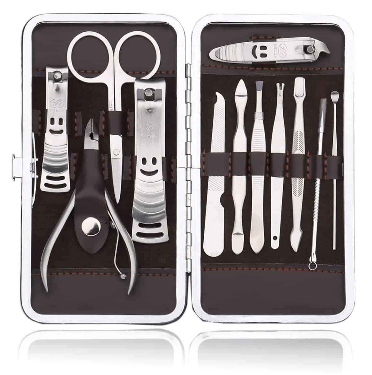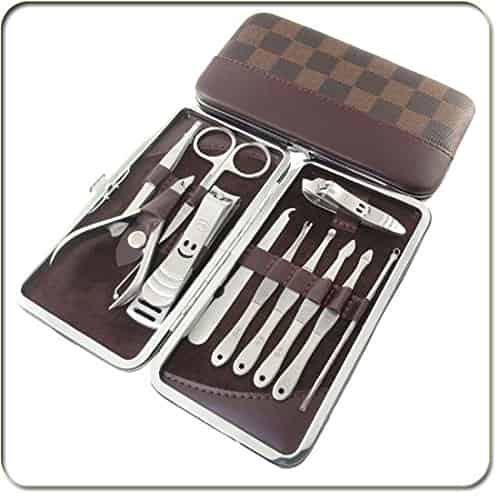 12 Pieces Manicure Pedicure Set Includes 3 Nail Clipper/Trimmers, 1 Scissor, 1 Blackhead Needle, 1 Cuticle Trimmer, 1 Ear Pick, 1 Eyebrow Tweezer, 1 Nail file, 1 Peeling Knife, 1 Singled-edged Double Side Stick, 1 V-shaped Push Stick.