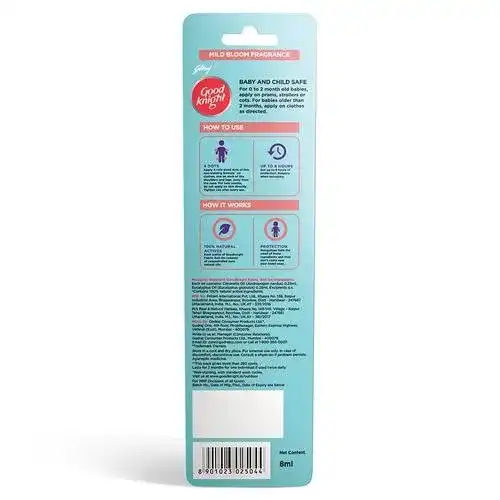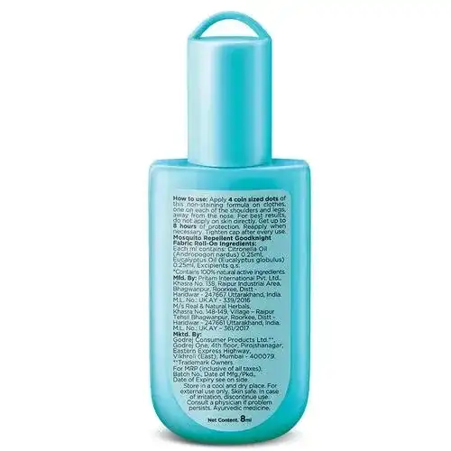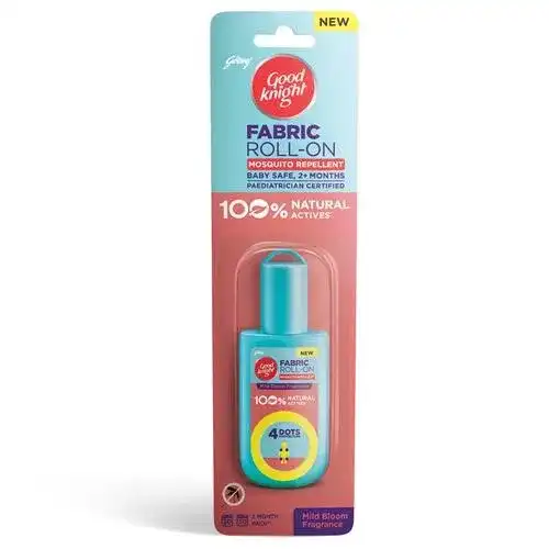 Goodknight Fabric Roll-On is an easy-to-use personal mosquito repellent, made using 100% natural and plant-based ingredients such as Citronella and Eucalyptus oil. Its unique non-staining formulation ensures your clothes are not stained after use. It provides complete protection for up to 8 hrs from all kinds of mosquitoes including those spreading Dengue, Malaria & Chikungunya. Goodknight Fabric Roll-On is certified by Paediatricians and is absolutely safe for babies and children of all age groups.