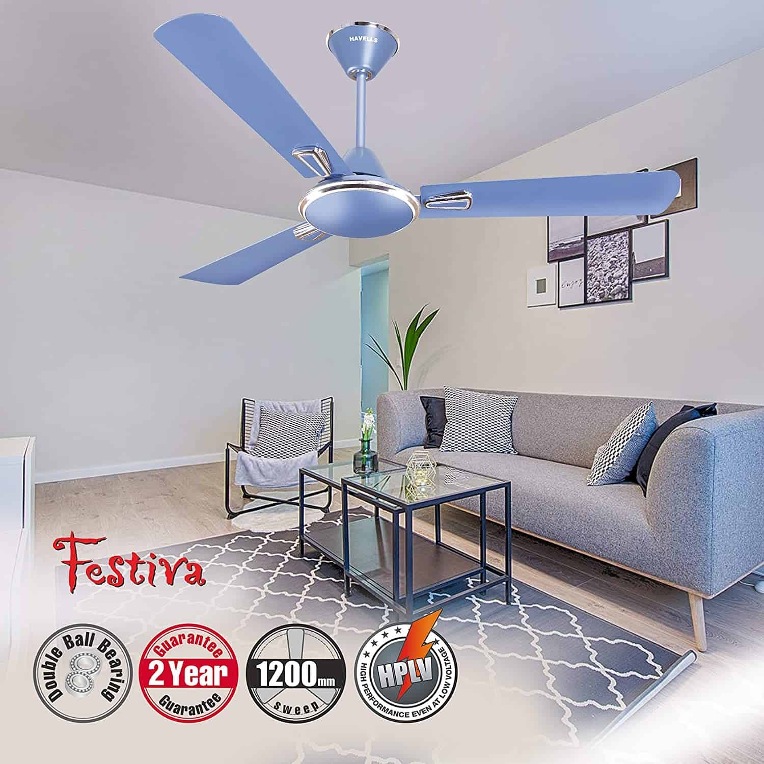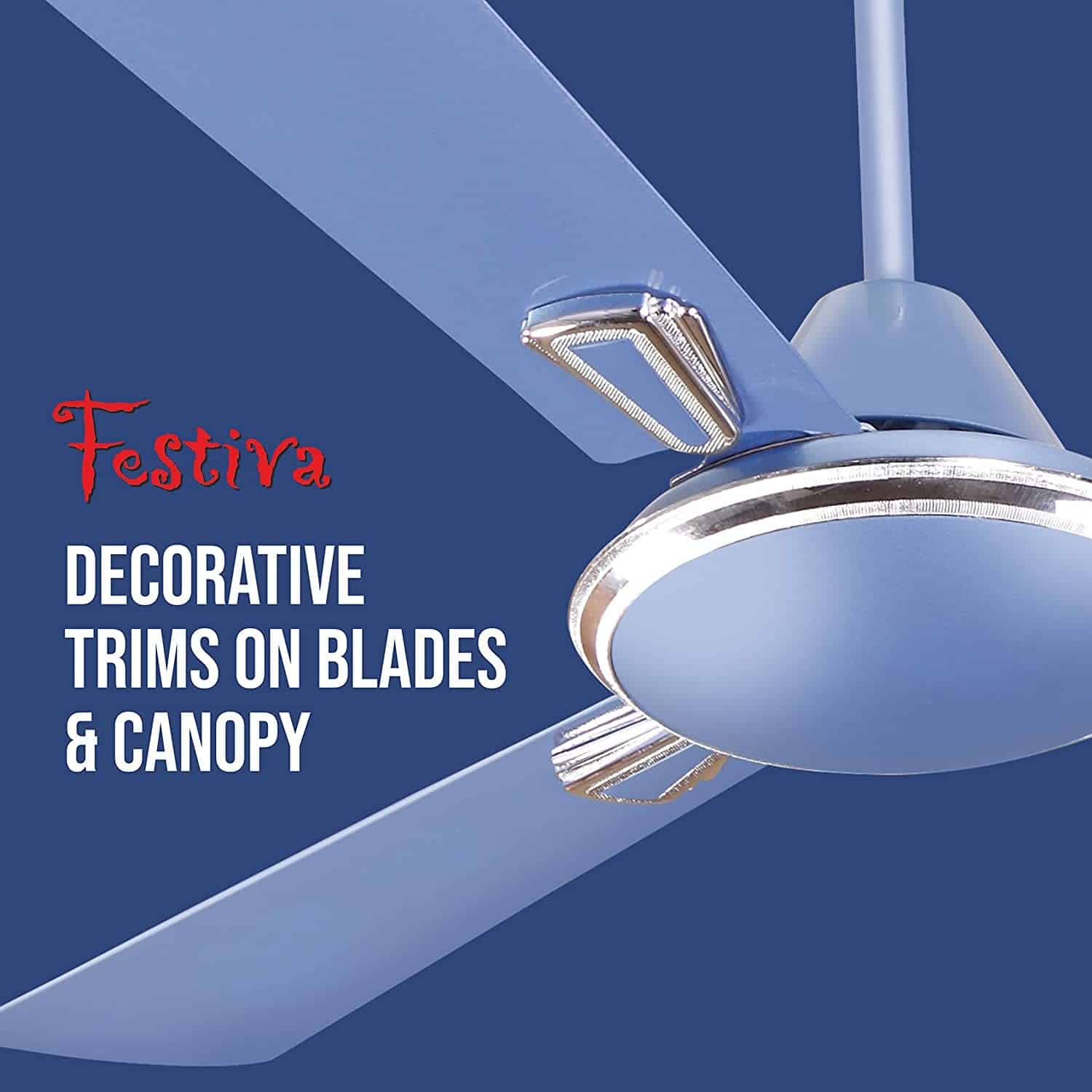 Now you can beat the humid weather and stay cool at home at all times with this efficient Havells Festiva Ceiling Fan (Ocean Blue). Owing to its 400 RPM and 1200 mm sweep, this 3-blade fan ensures enhanced air delivery and cools down a room quickly. You can conveniently change the fan's speed to maintain a comfortable temperature with the help of its 4 speed settings. You may rest assured that this ceiling fan will go well with any kind of decor, as it is painted a Ocean Blue hue and sports a special finish.