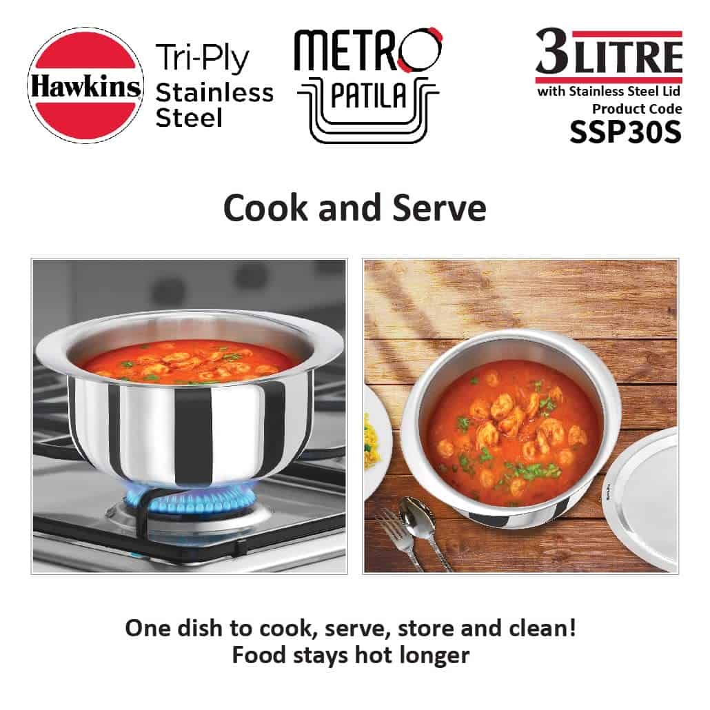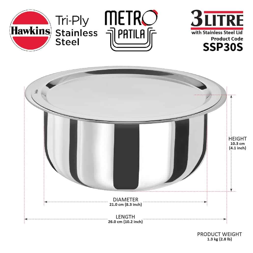 Hawkins 3 Litre Metro Patila, Triply Stainless Steel Tope with Stainless Steel Lid Silver (SSP30S)