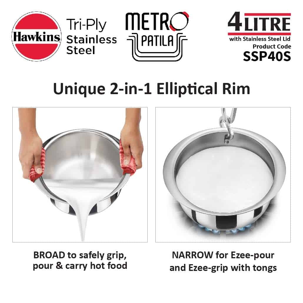 Hawkins 4 Litre Metro Patila Triply Stainless Steel Tope with Stainless Steel Lid (SSP40S)