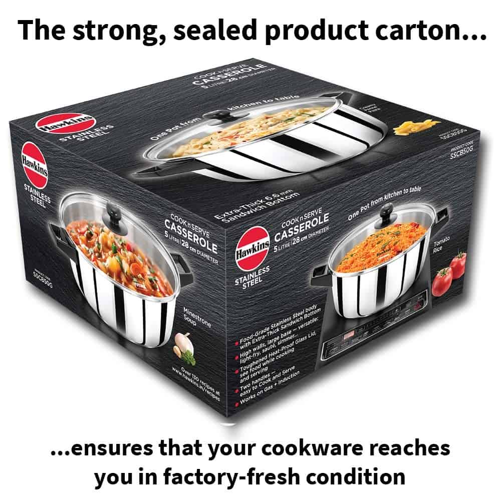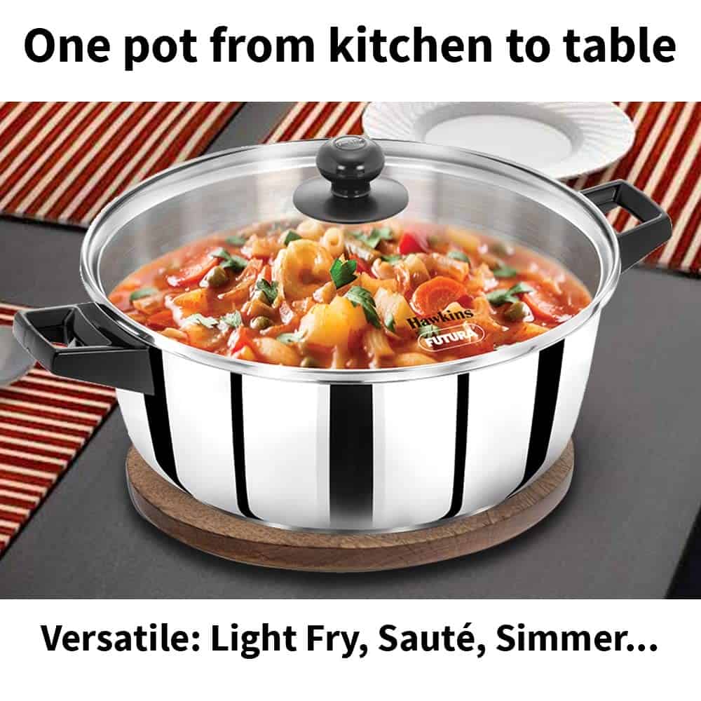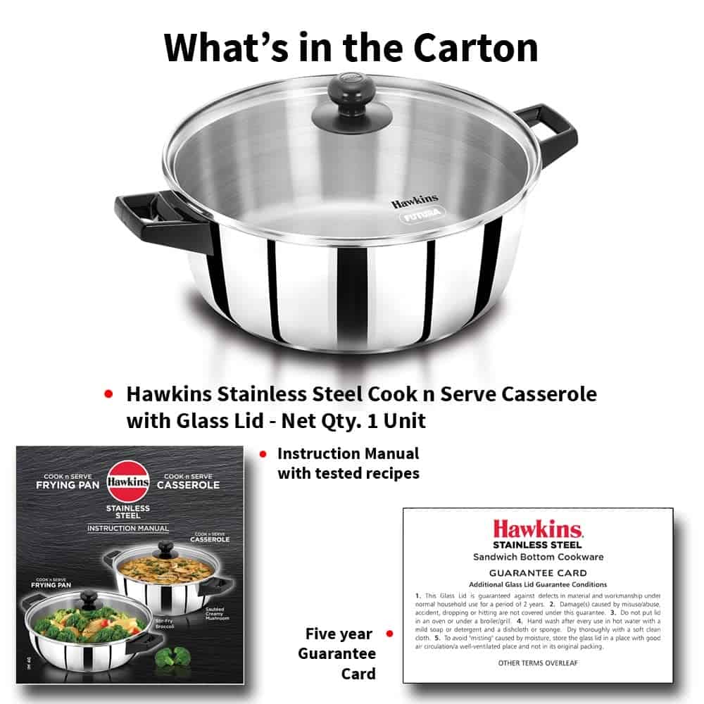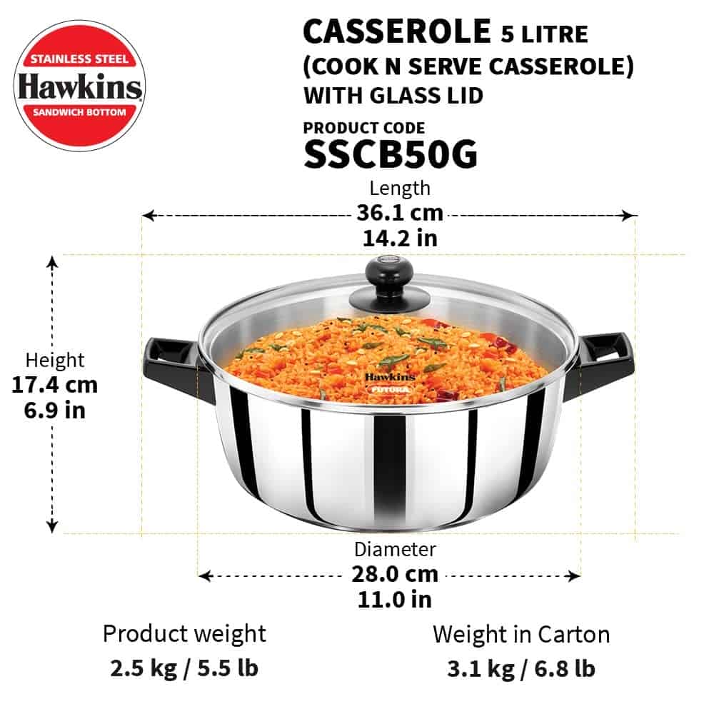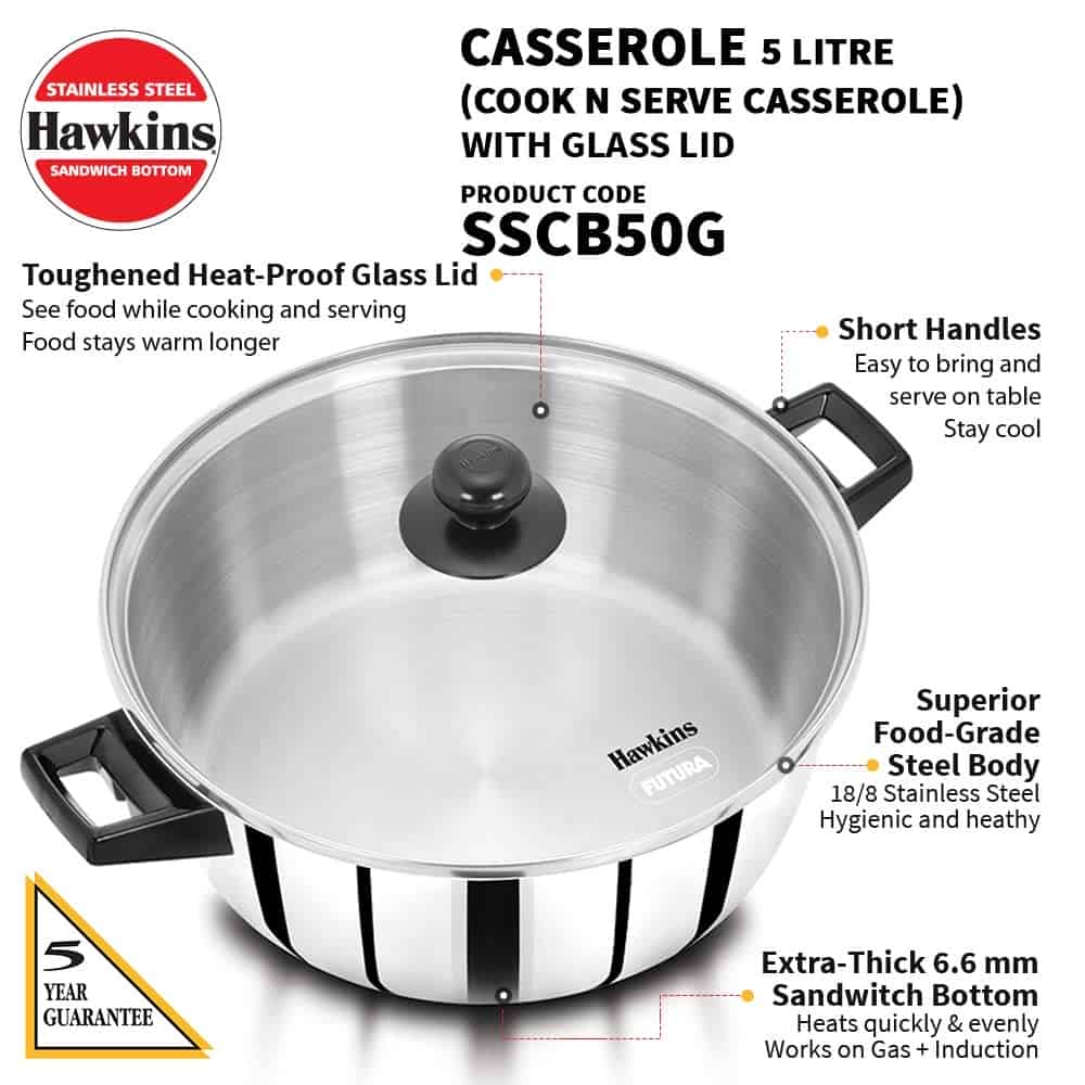 Hawkins 5 Litre Cook n Serve Casserole, Stainless Steel Saucepan with Glass Lid (SSCB50G)