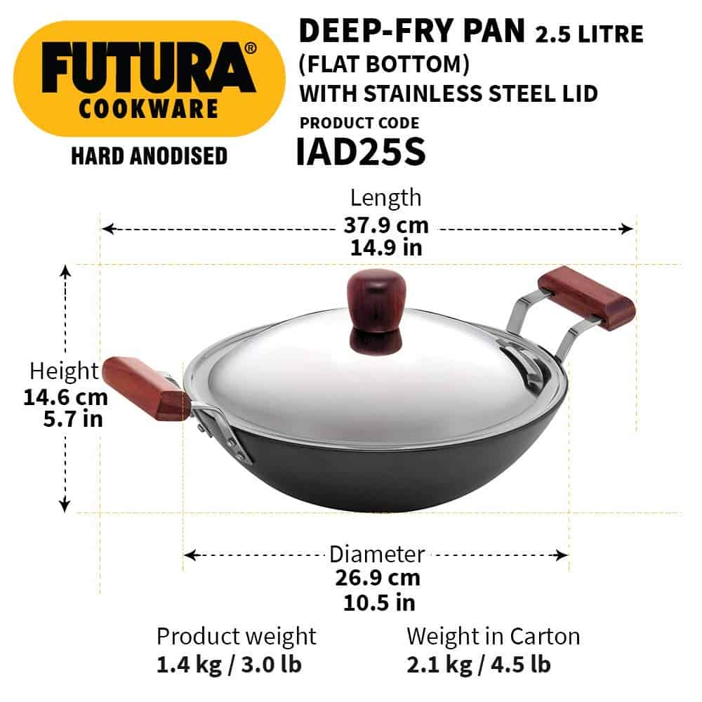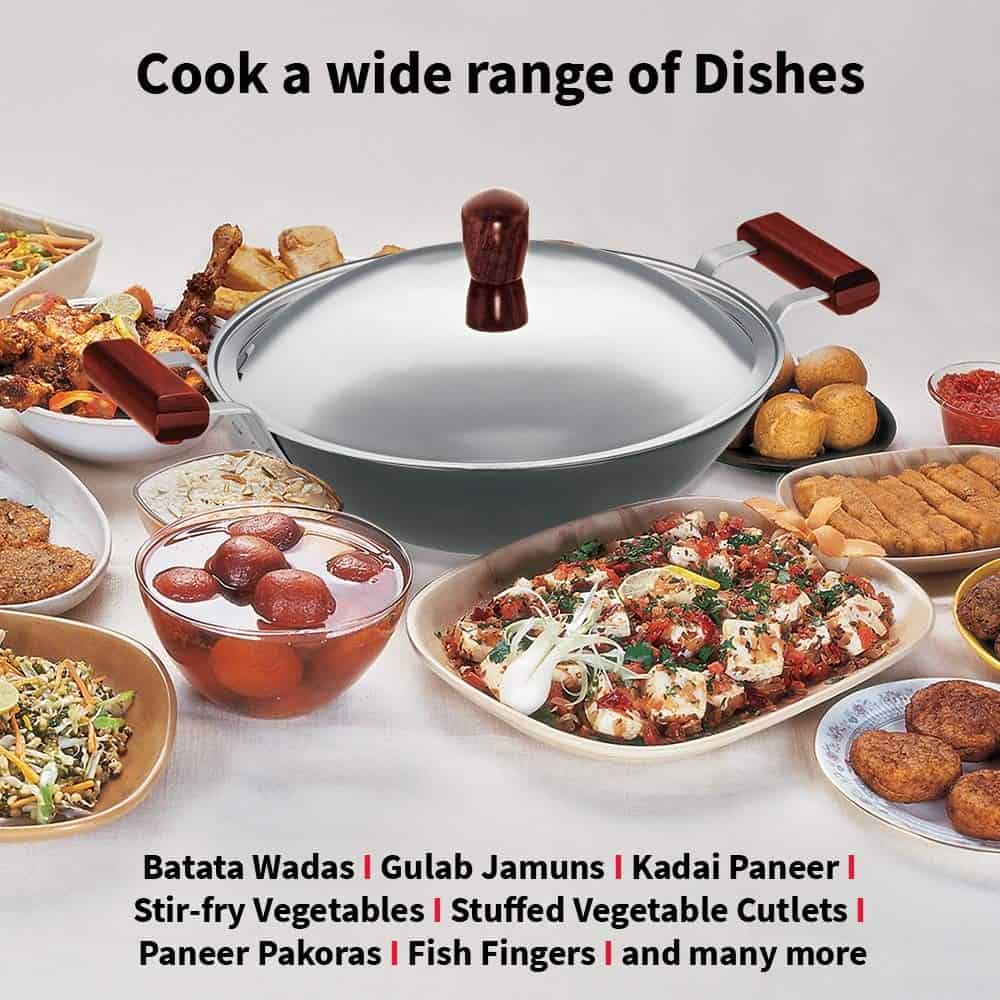 The pan has curved sides suitable for deep-frying and stir-frying and is provided with a stainless steel lid