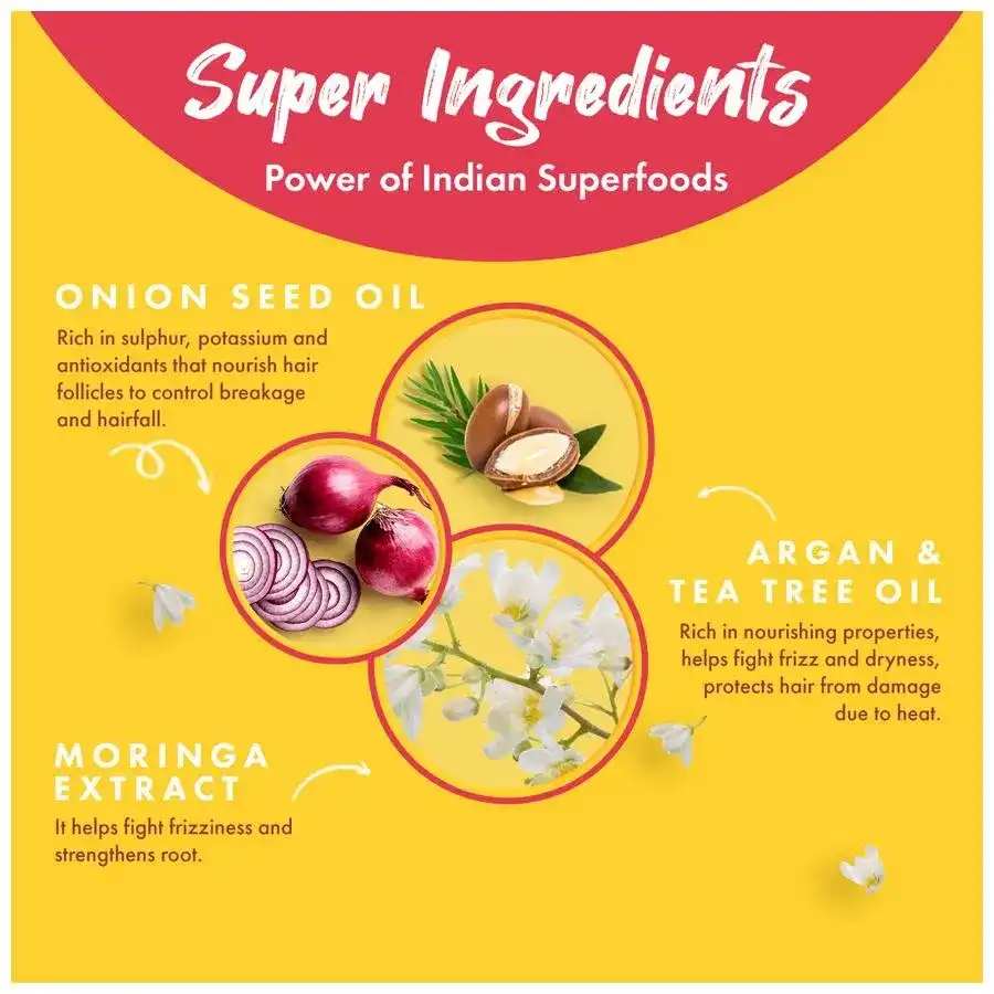 This nutrition-rich onion serum replenishes and strengthens your hair, combats hair breakage and keeps them soft. High concentrations of Onion Seed Oil deeply nourish hair and prevent frizz. Moringa, a powerful superfood, strengthens and smoothens hair without drying them and natural oil in this product like Argan Oil replenishes hair with ample moisture for their shine.
