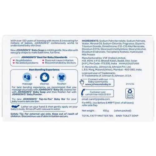 Johnson's baby soap is enriched with Vitamin E. Easy to grip bar for bathing your newborn, recommended by the doctors. No Sulfates, No Parabens, No Dyes. Johnson's baby soap has a rich, creamy lather that gently cleanses and helps keep your baby's skin soft and supple. Preserves baby's natural skin moisture. Clinically mildness proven.