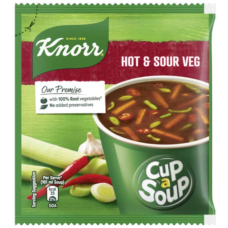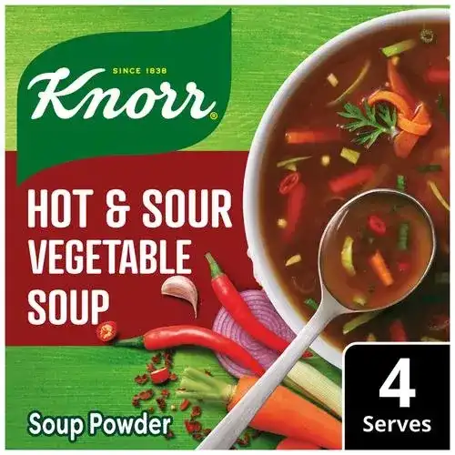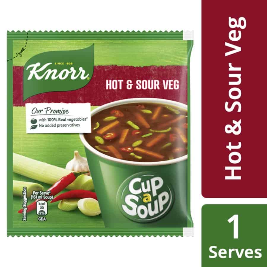 Knorr Hot & Sour Veg Cup-A-Soup is a little hot, a little sour - adds a Chinese zing every time you sip the Knorr Hot & Sour Veg Cup-A-Soup. Knorr Hot & Sour Veg Cup-A-Soup satisfies your small hunger pangs in just 1 minute. Its crunchy, delicious and easy to make every time. Made with 100% real vegetables and no added preservatives, this soup is ready in three simple steps. So now enjoy Restaurant like delicious Soup at home.Knorr Soups range comprises 11 delicious flavours of 4 serve soups and 7 flavours of Cup-a-soup. Great taste is in our Nature! Knorr has gone to great lengths to ensure a perfect blend of Ingredients and consistency that give you Restaurant like Soup at home.