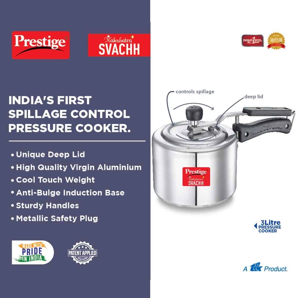 The Prestige Svachh No-Mess cooker comes with a unique lid that