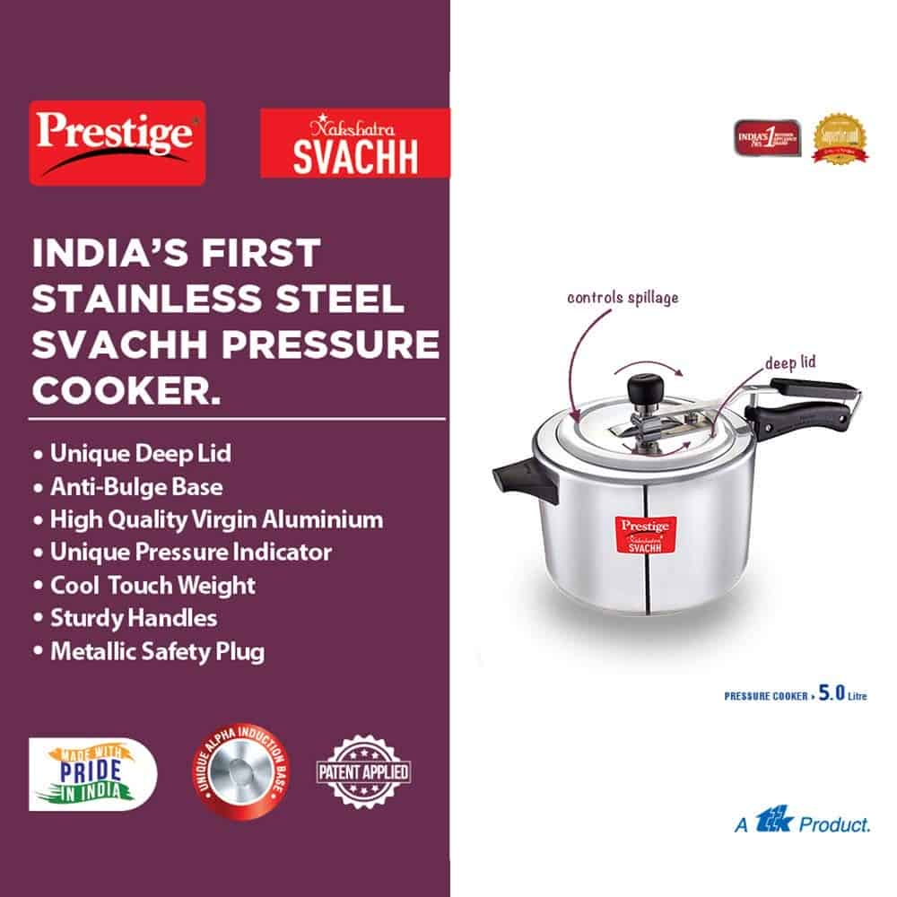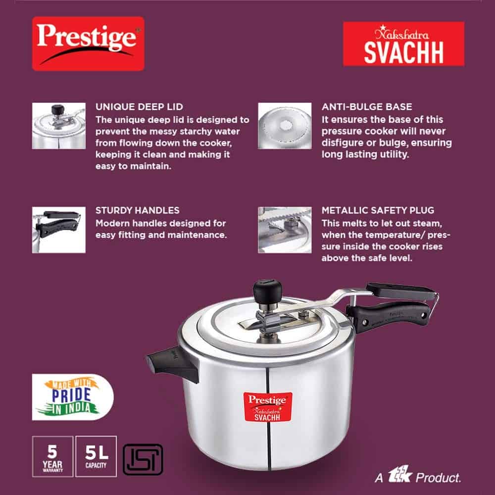 • Package Contents: 1 unit of 5 litre Aluminium svachh pressure cooker