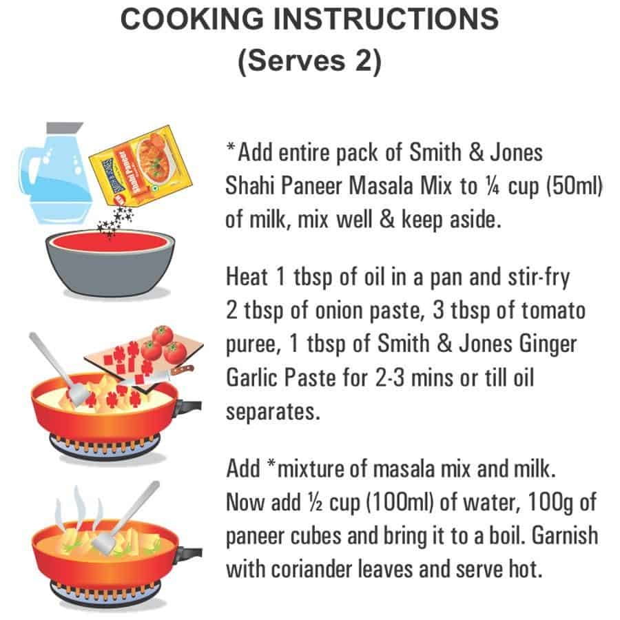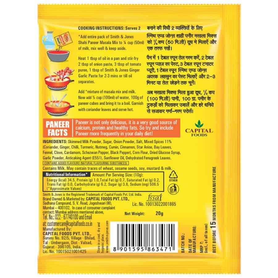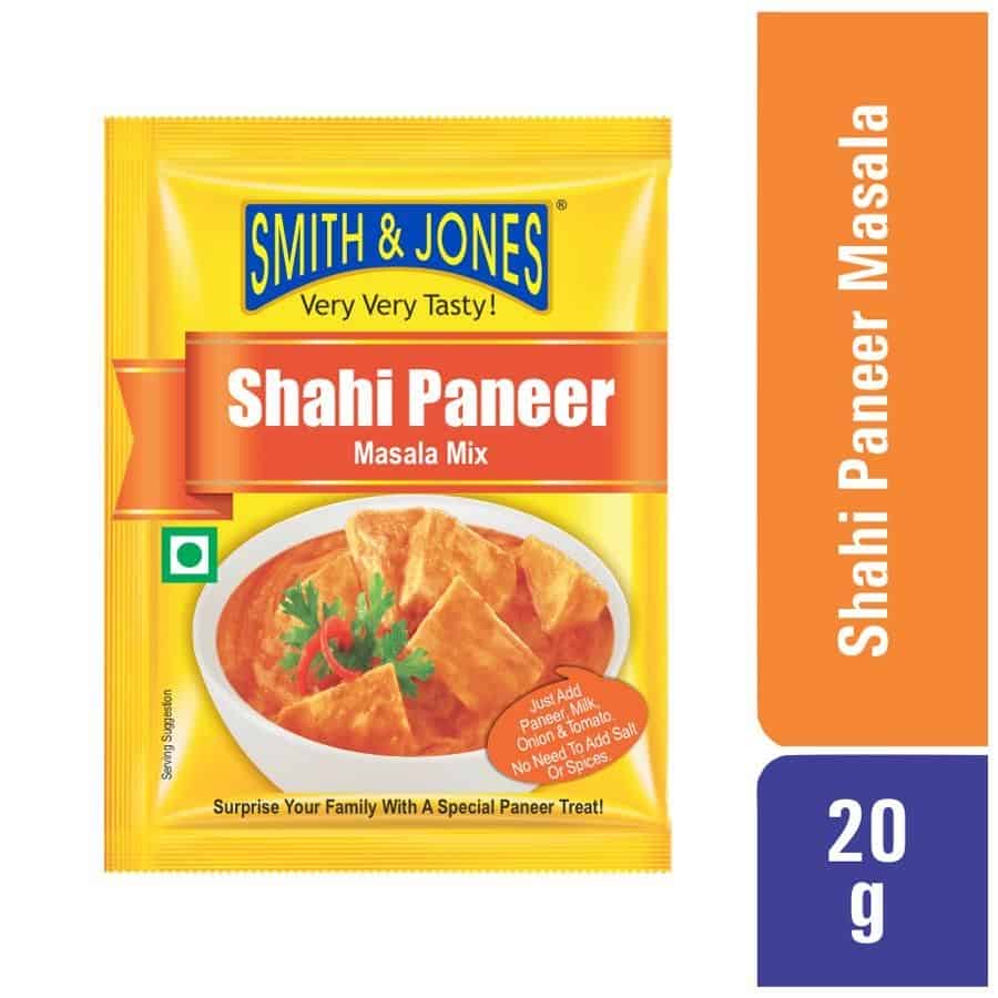 Smith & Jones Shahi Paneer Masala Mix is blend of selected spices. It contains spices like cumin and cinnamon, coriander, cardamom, anistar, fennel and many more. This enhances the flavour and aroma of the Shahi paneer. It helps you prepare delicious and tasty dish. This mix gives the dish a great texture and is flavourful. It does not contain any added preservatives and no artificial color.