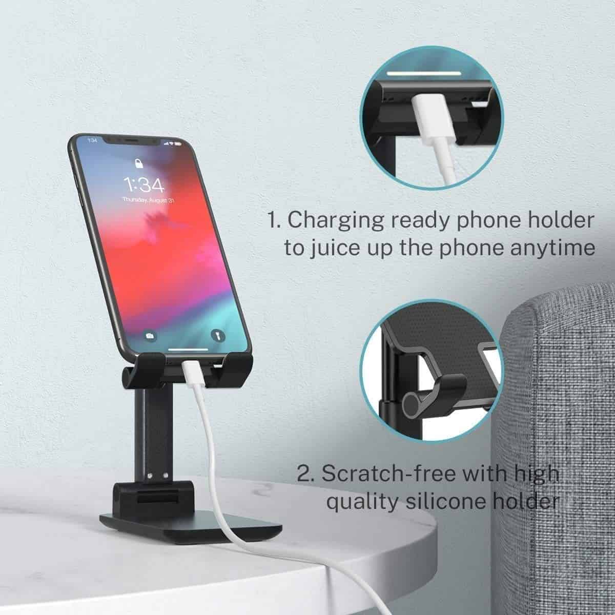 【Height & Angle Adjustable】: This mobile phone stand can be easily adjusted designed to the (0°~ 72°) angle and 1.64 inch height adjustable which ergonomic, and it stays firmly in place what you want. The higher height arm provide comfortable viewing angle which helps to fix your posture and reduce neck & back & arm strain and even protect your vision.