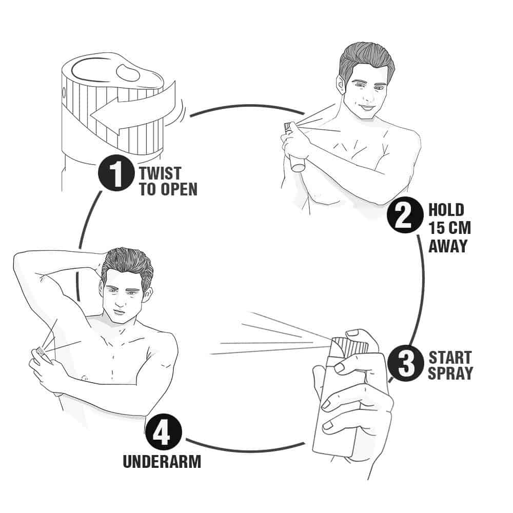• Direction to use: Hold the can upright 10-15 cm away from your body and safely spray it on your skin or clothes, avoiding your eyes